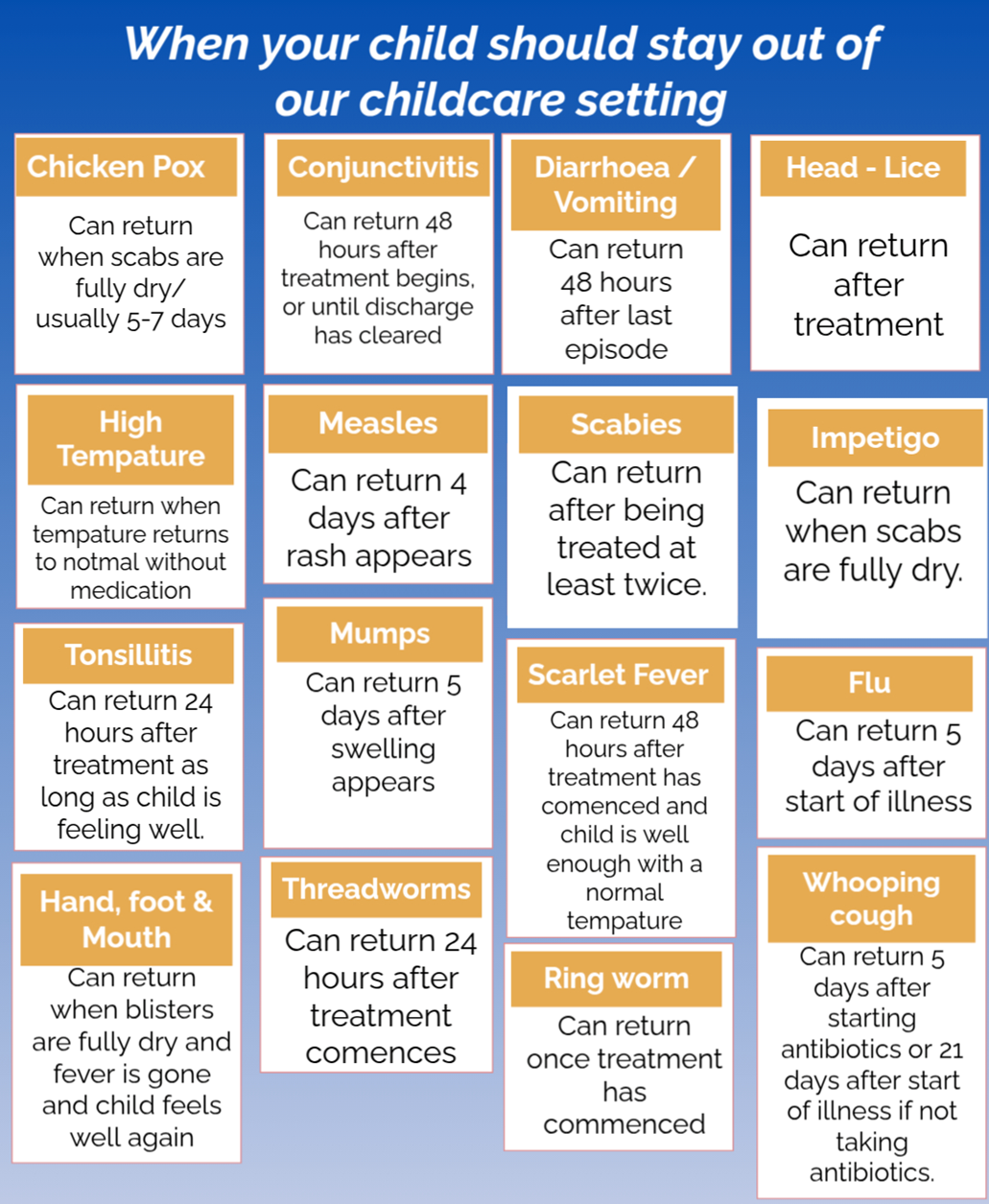 - We have included a list of illnesses and conditions that may arise and a note to confirm when the child can return to the service.